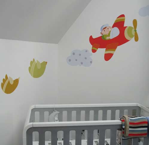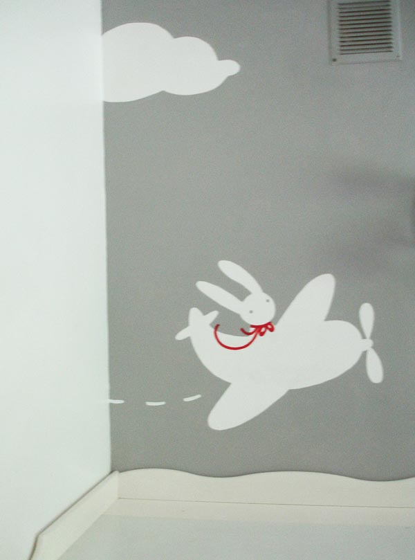 December elején Áginál és Tamásnál festettem gyerekszobai dekorációt leendő kisfiuk számára. Mivel nemcsak egy gyermeket terveznek, ezért nem törekedtünk kimondottan kisfiús falra. A gyerekszoba már majdnem készen volt, amikor a munkát elkezdtem, így a meglévő színvilág is segített egy kicsit.